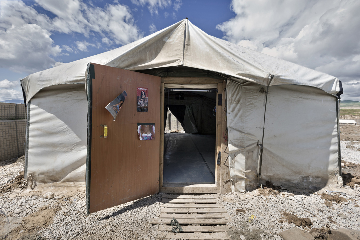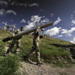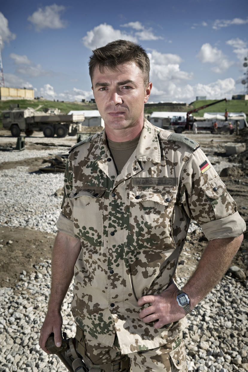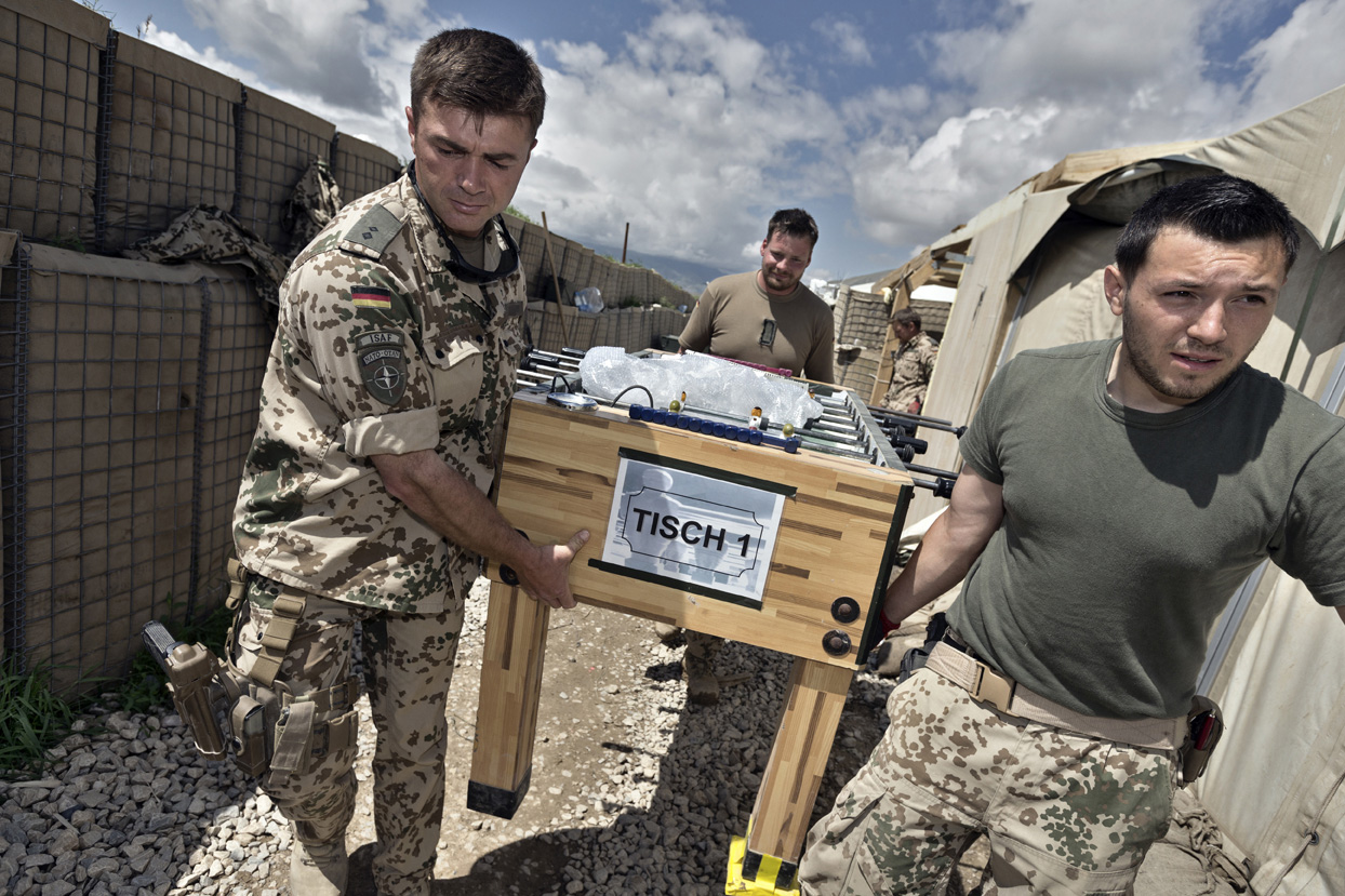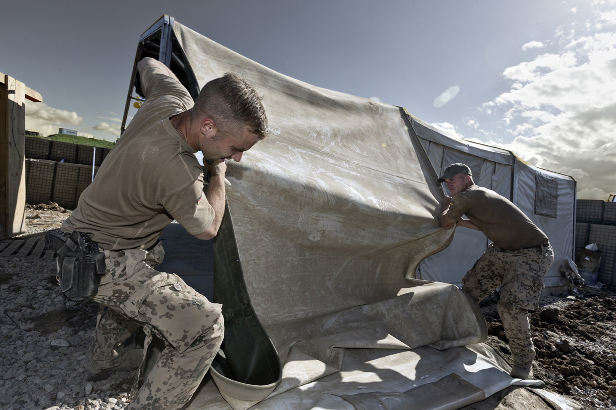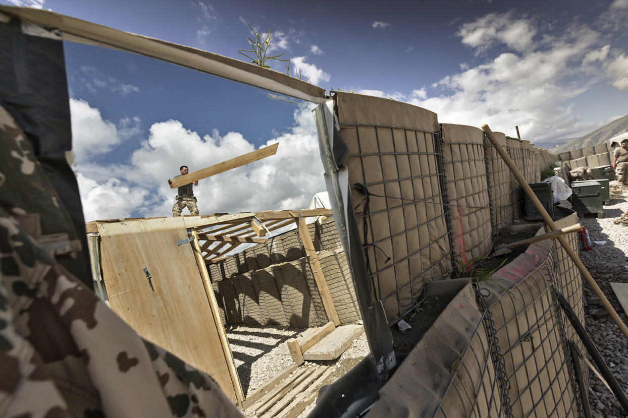 Während Pioniere in routinierter Fertigkeit mit dem Abbau der Mannschaftszelte und dem Packen der Container beschäftigt sind, tragen Soldaten die großen Holzkreuze, die an ihre getöteten Kameraden erinnern, sorgsam von einer Anhöhe des Stützpunktes fort.