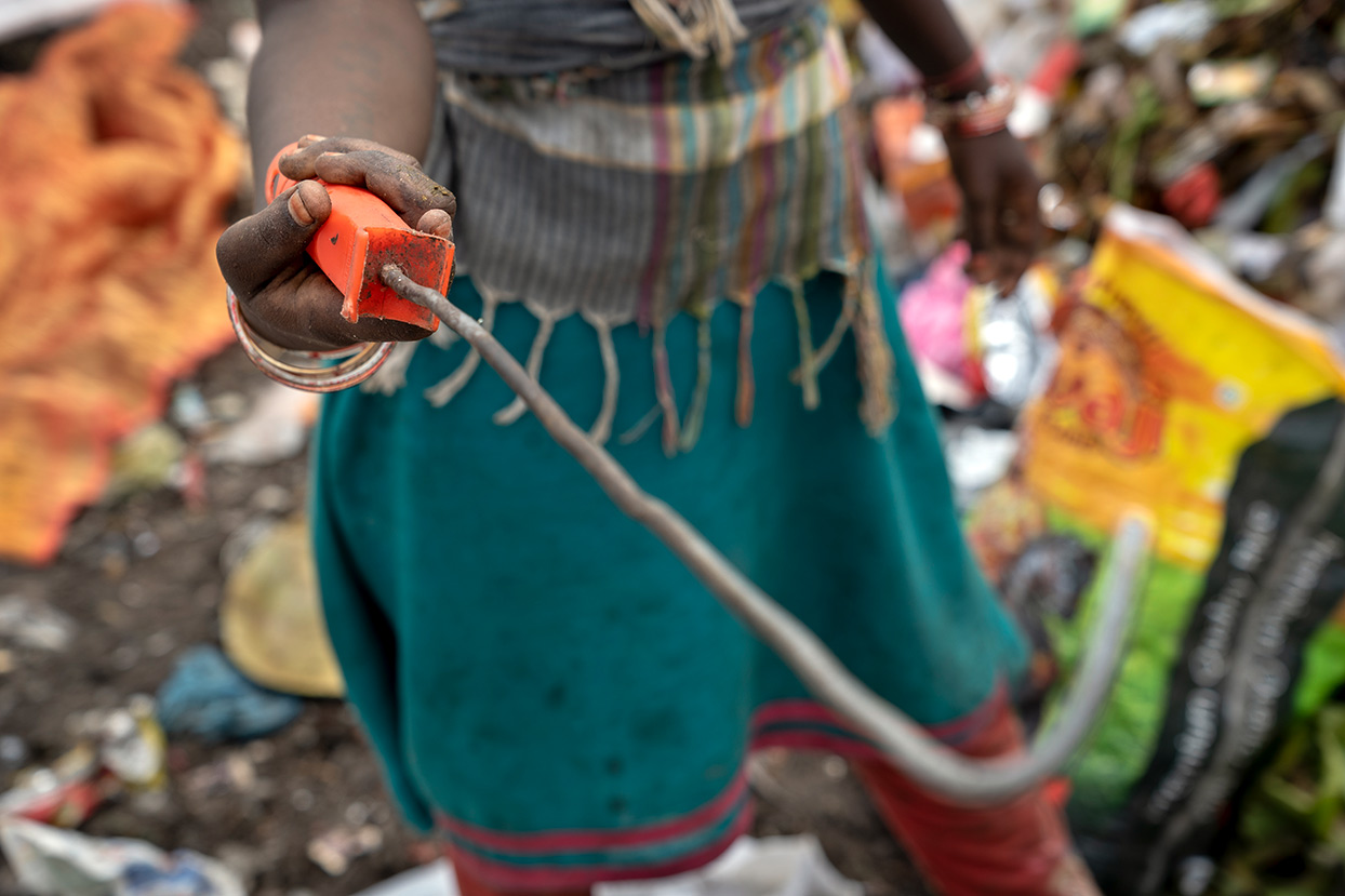 Mit dem gerade gebogenen Draht einer Tapezierrolle, dessen Ende zu einem Art Angelhaken geformt wird, zerren die Müllsammler aus dem Wust an Abfällen alles an wiederverwertbaren Materialien. Angefangen von unterschiedlichen Kunststoffen, über Saris, dessen Bahnen zu riesigen Säcken für PET-Flaschen genäht werden, bis hin zu Metallsorten wie Aluminium und Eisen. So bilden die „Unberührbaren“, die Ausgegrenzten der indischen Gesellschaft das „Rückgrat des Recycling-Systems in Indien“ (Umweltexpertin Mukherjee).